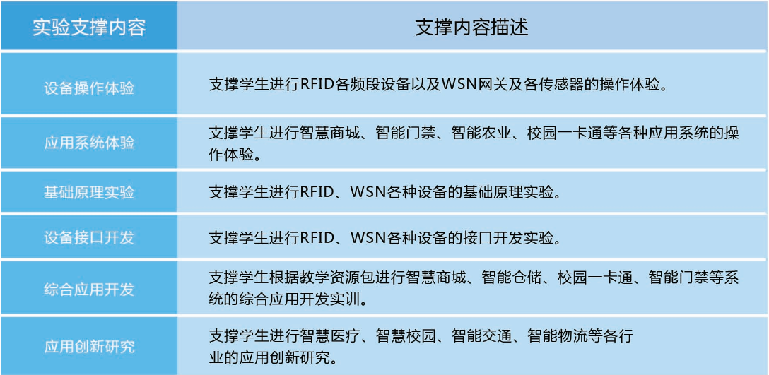 《物聯網虛擬仿真實驗平臺》虛擬仿真了各種RFID、WSN等常見的物聯網感知層設備。具有真實設備的完整接口和特性,可以通過串口及網絡進行訪問??梢灾蔚膶嶒瀮热萑缦卤硭荆?/span>
